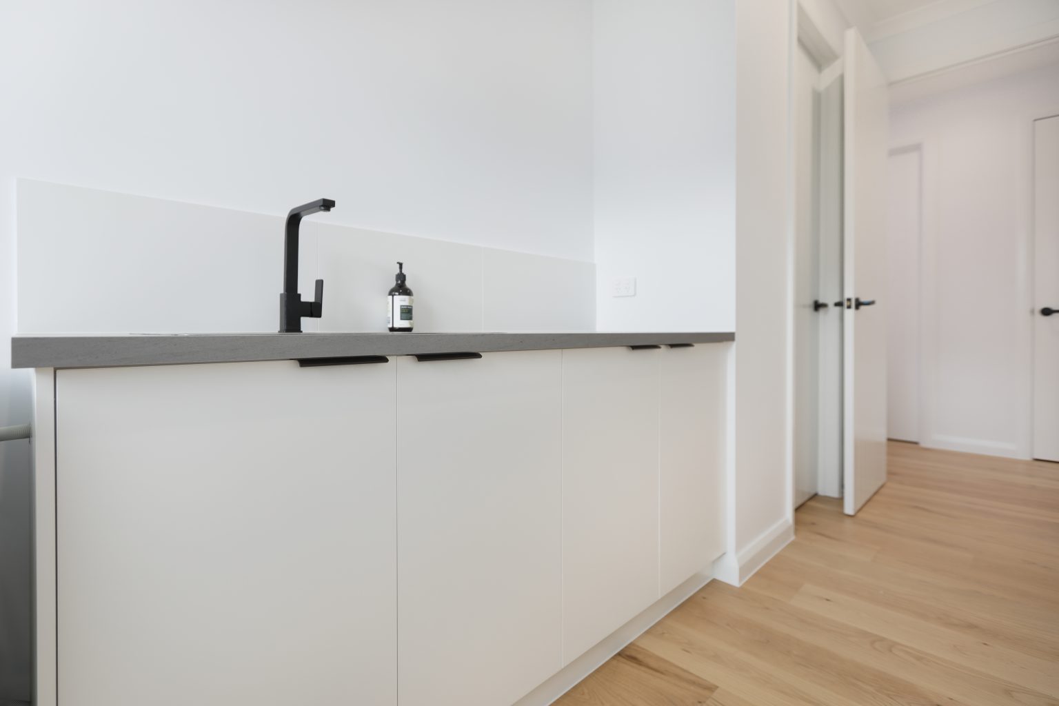 • Custom built soft close base cabinetry with laminate benchtop.