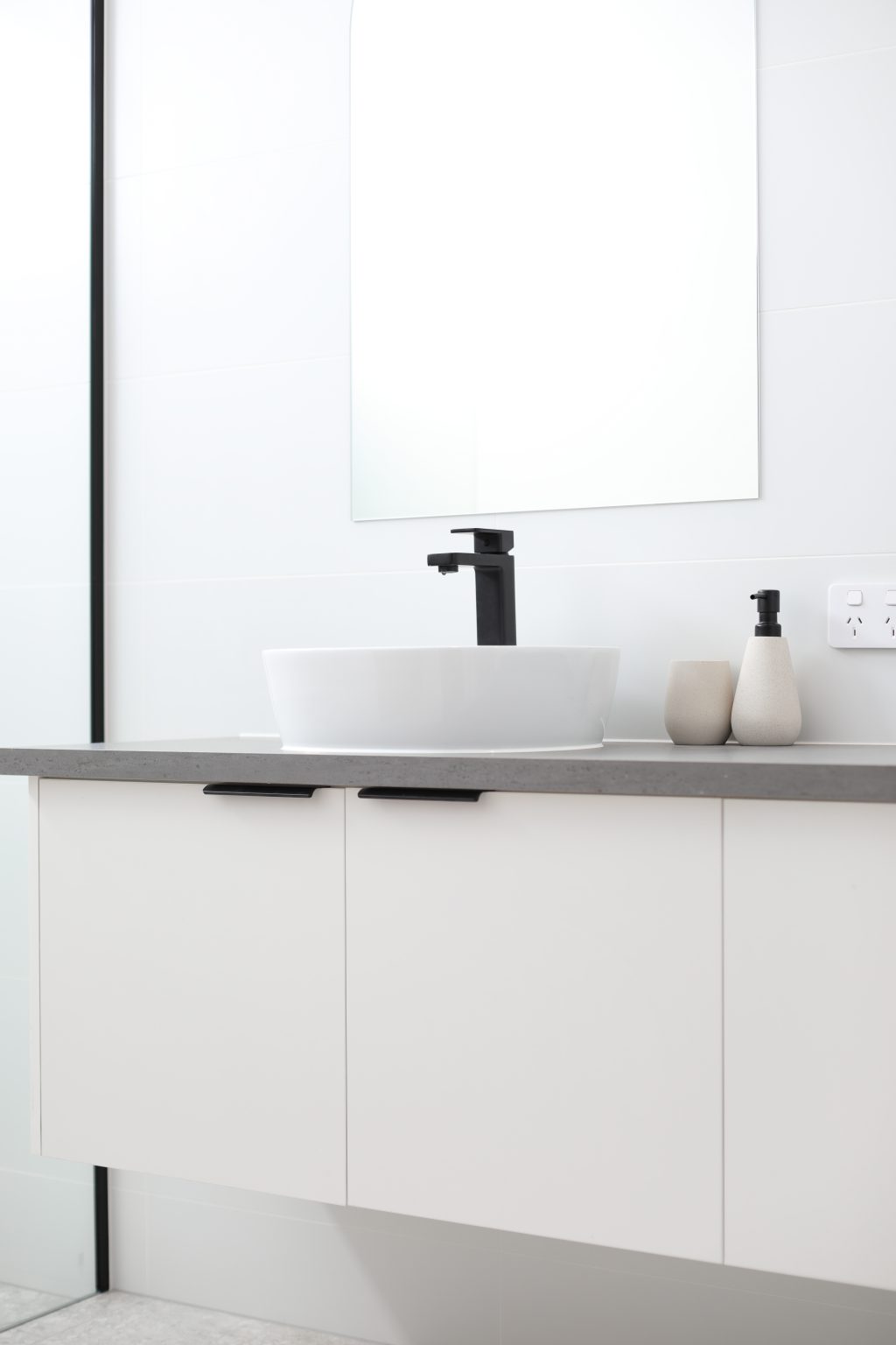 • Custom built floating vanity with soft close cabinets and laminate benchtops.